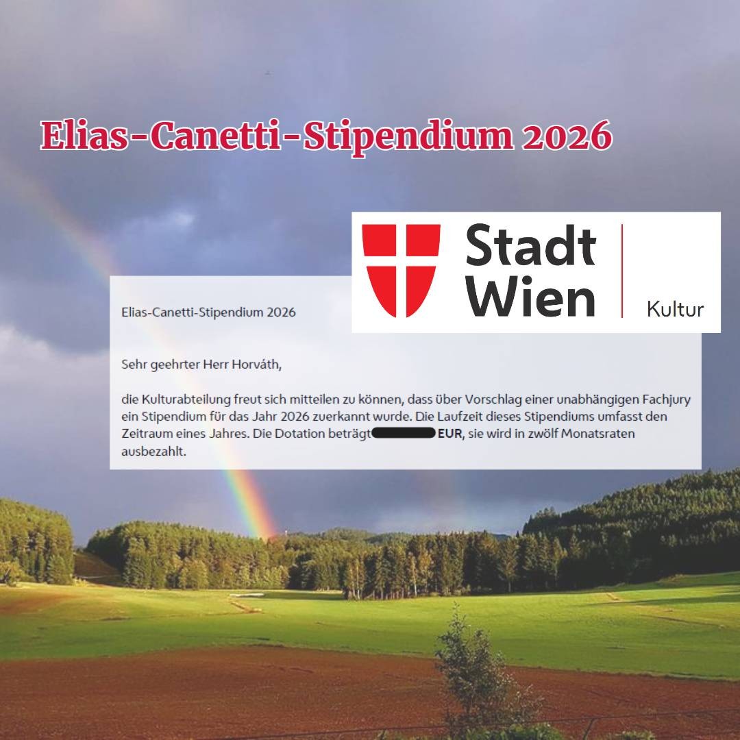 Martin Horváth erhält 2026 das renommierte Elias-Canetti-Stipendium der Stadt Wien für die Arbeit an seinem vierten Roman (Arbeitstitel: Furor). Das nach dem gleichnamigen Nobelpreisträger benannte Stipendium ermöglicht AutorInnen, die bereits ein repräsentatives Werkverzeichnis vorweisen können, sich über einen längeren Zeitraum hinweg ausschließlich und ohne materielle Sorge auf ihre schriftstellerische Arbeit konzentrieren zu können. Bisherige StipendiatInnen waren u.a. Robert Menasse, Josef Haslinger, Christoph Ransmayr, Daniel Kehlmann oder Dimitré Dinev.